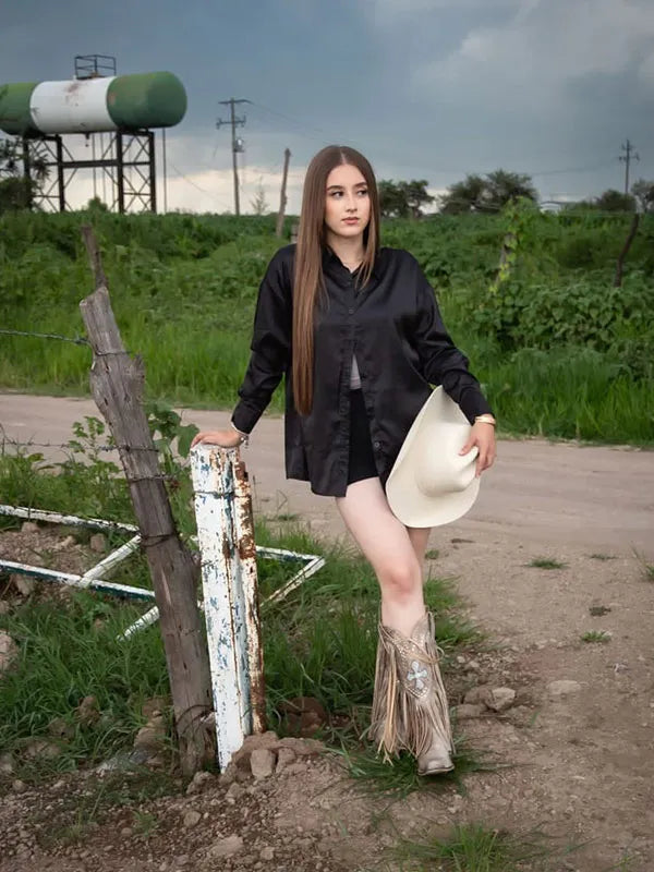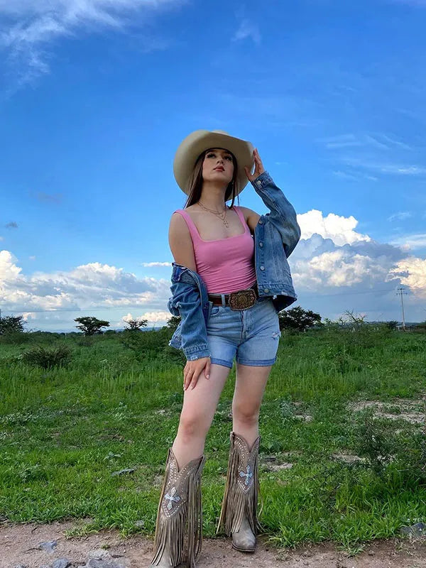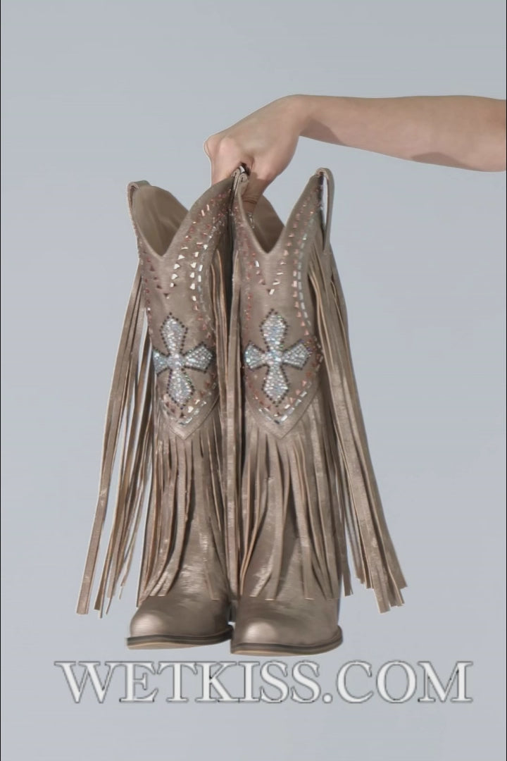 ¡Causa una gran impresión con estas cautivadoras botas vaqueras para mujer! El lujoso terciopelo de color arcilla crea un sofisticado fondo para este atemporal diseño de bota vaquera. Siente la energía juguetona de los flecos que bailan con cada paso. Tus miradas se dirigirán a la parte delantera de la caña, donde brilla un brillante patrón cruzado, formado por una serie de diamantes de imitación cuidadosamente colocados.