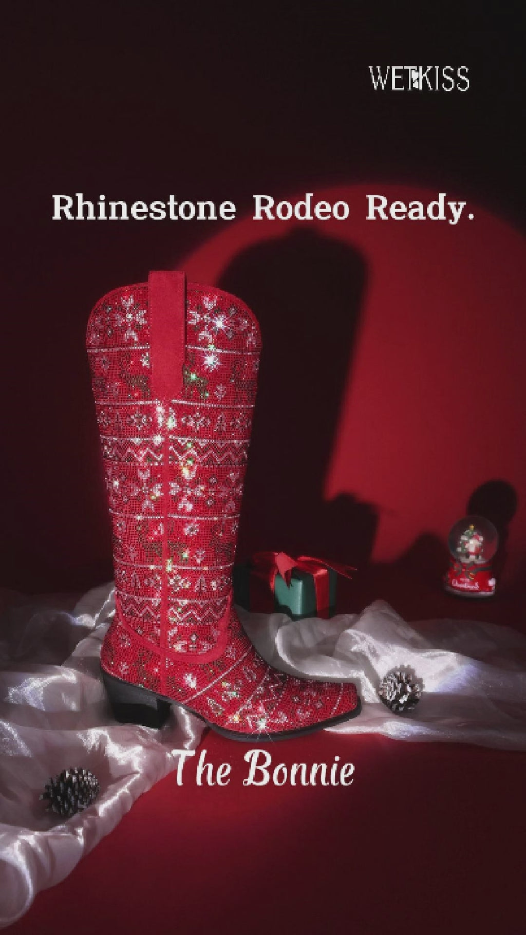 These red knee-high boots sparkle with rhinestone designs of elk, snowflakes, Christmas trees, and geometric patterns. Eye-catching under the light, they bring festive charm and a touch of warmth, making them perfect for Christmas celebrations.