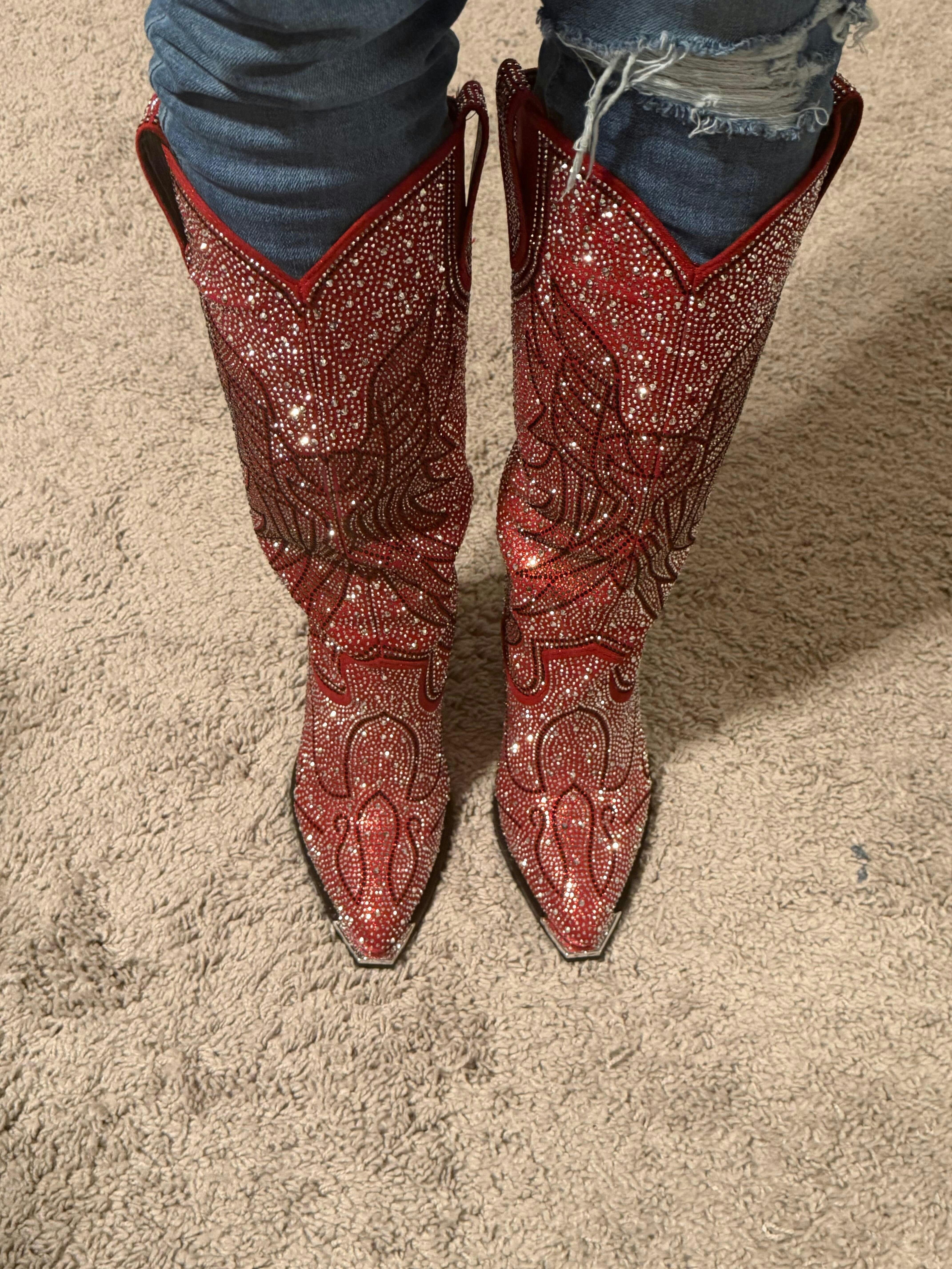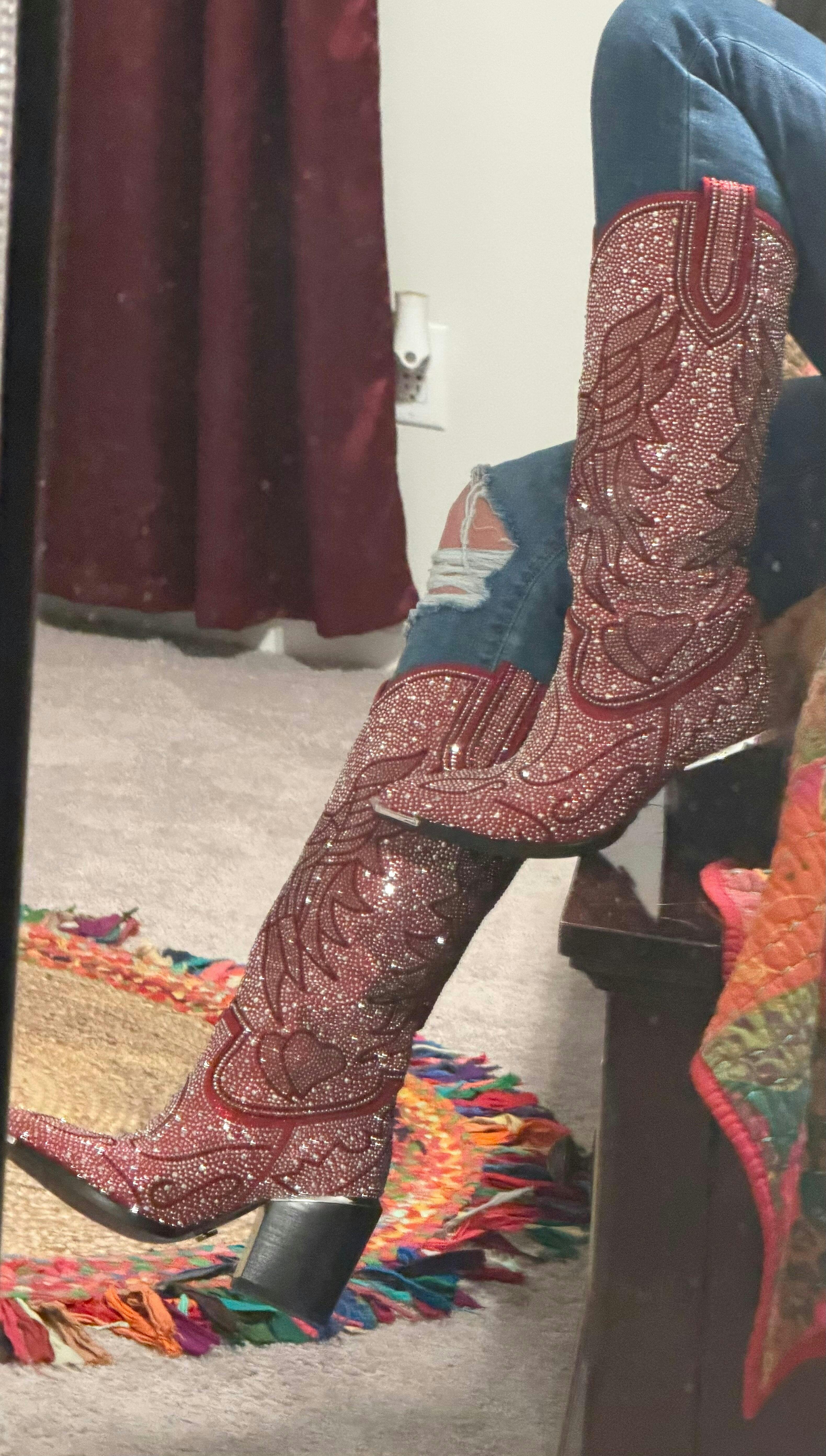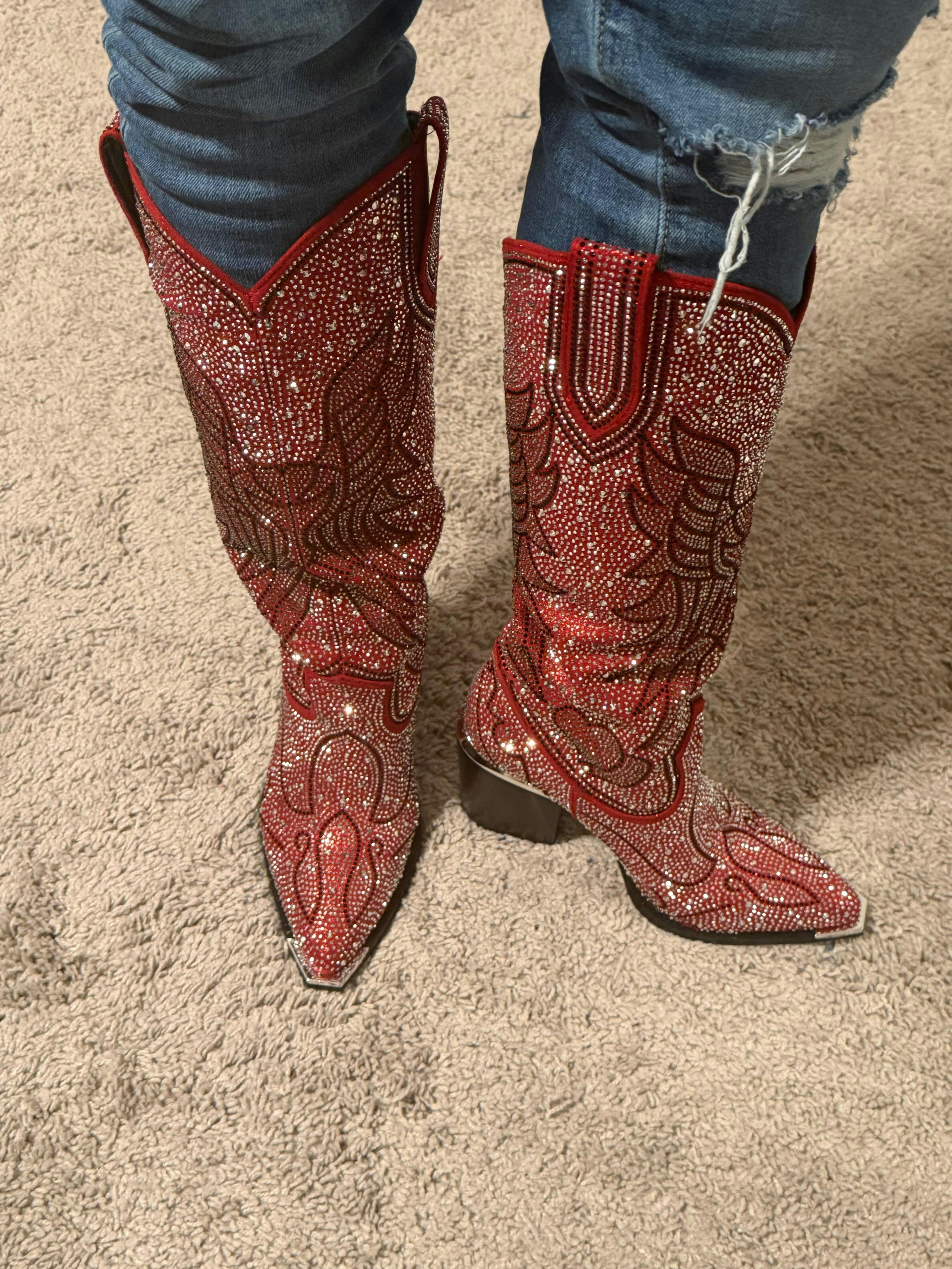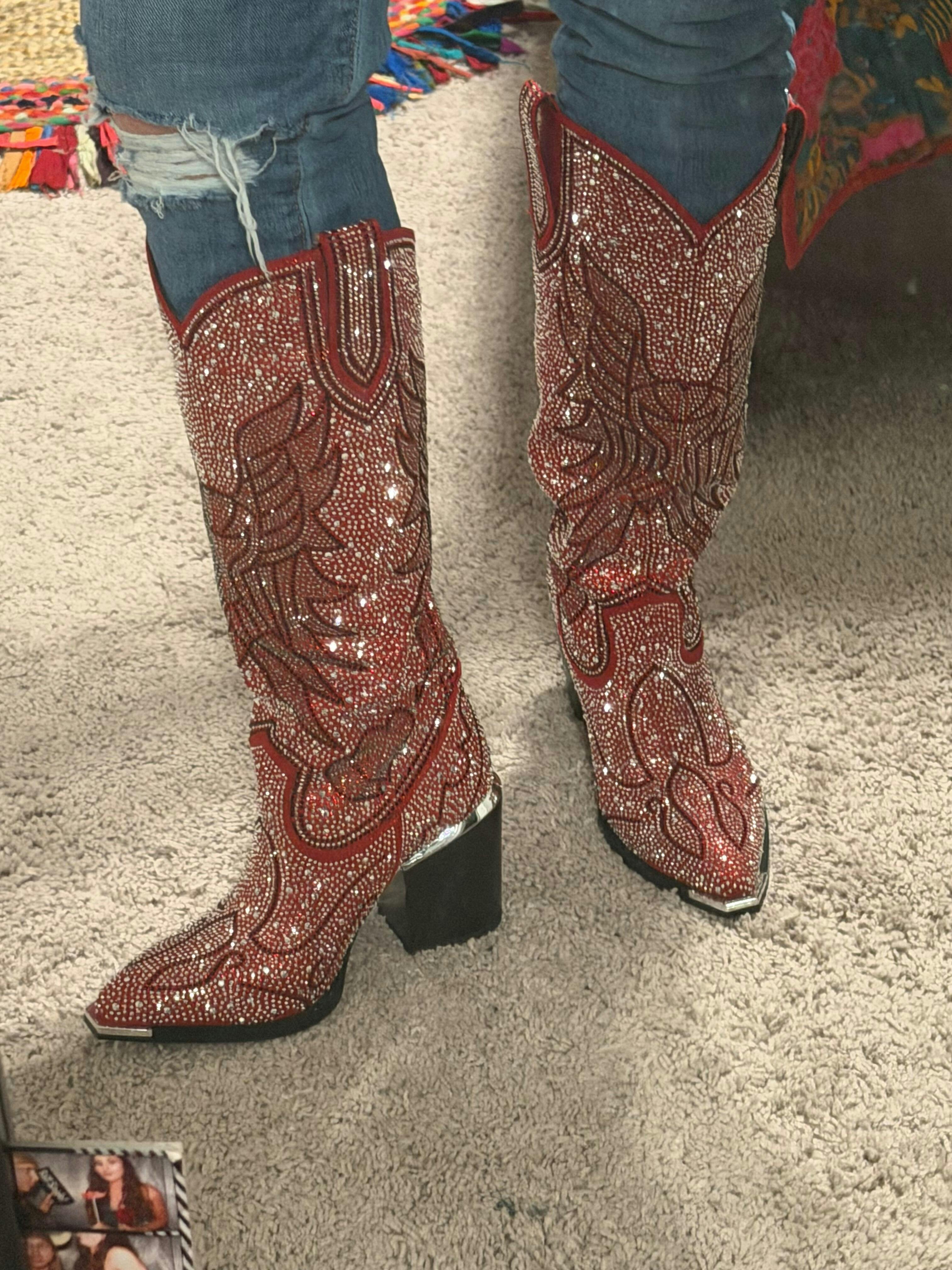 ¡Dale un toque de valentía con estas increíbles botas vaqueras rojas! Cubiertas de brillantes diamantes de imitación plateados y acentuadas con un intenso diseño de alas de diamantes de imitación negros, estas botas combinan a la perfección pasión y libertad. Su original puntera de acero le da un toque imponente. ¡Adéntrate con confianza en cualquier escenario y domina la escena!