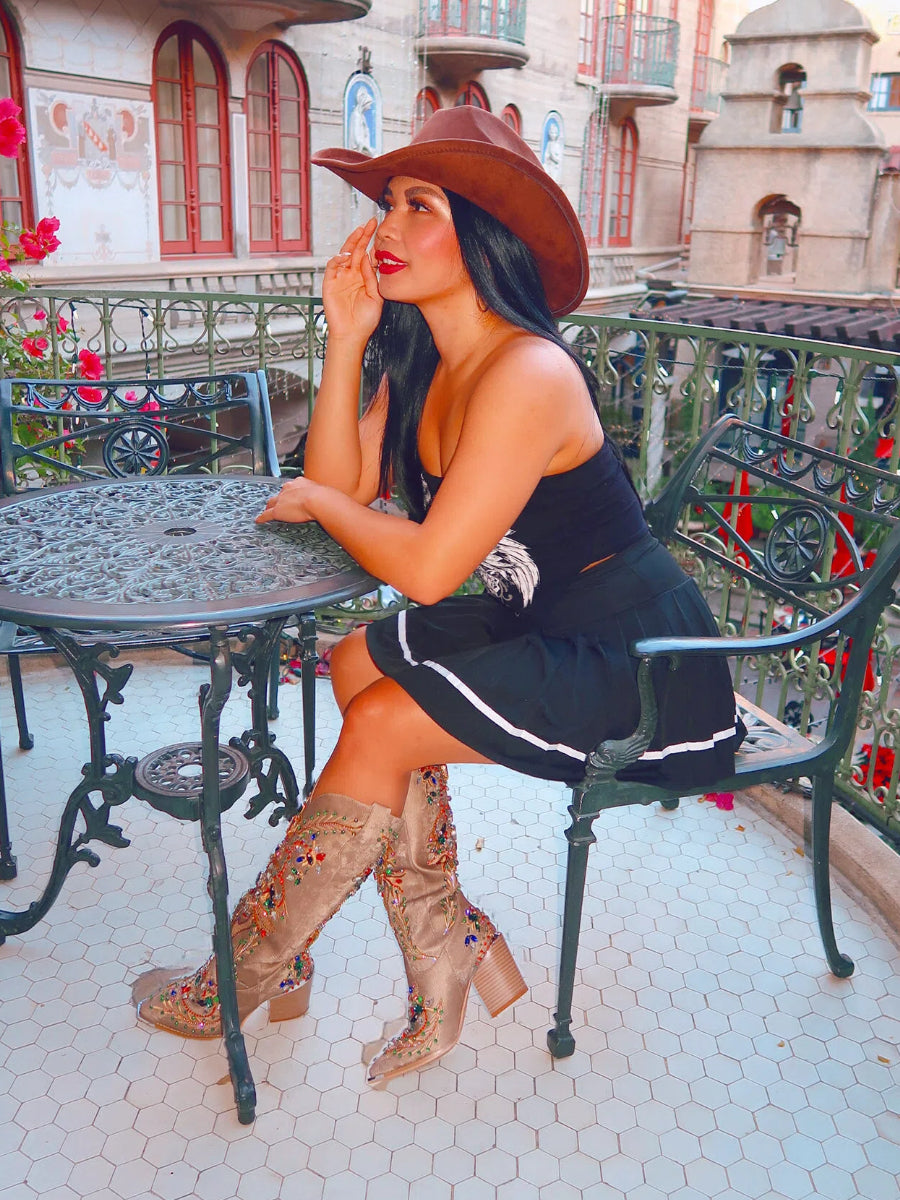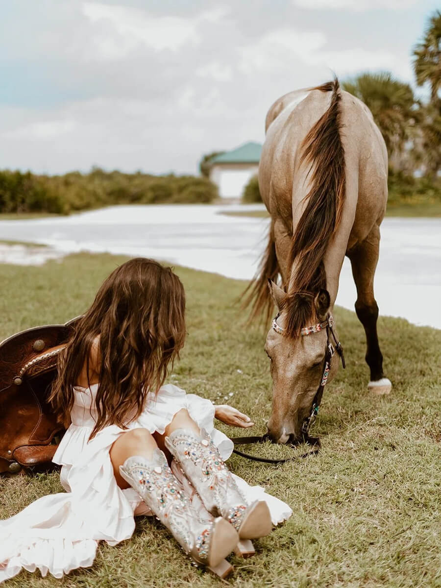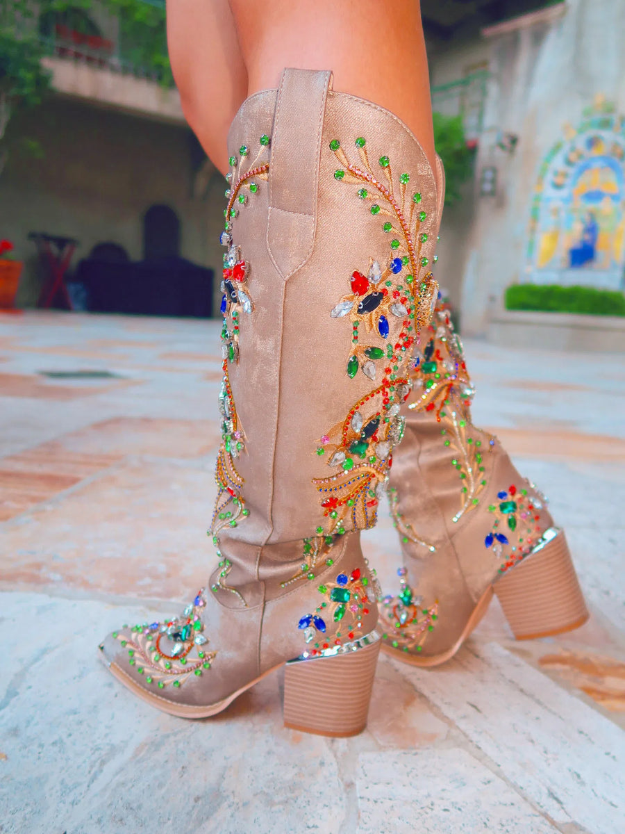 ¡Impresiona con estas deslumbrantes botas vaqueras altas! Combinando la tradición del oeste con un toque moderno, lucen joyas de colores colocadas a mano que brillan a cada paso. El diseño único de la puntera de acero aporta una elegancia vanguardista, mientras que el tacón grueso y la gamuza sintética de primera calidad ofrecen la máxima comodidad.