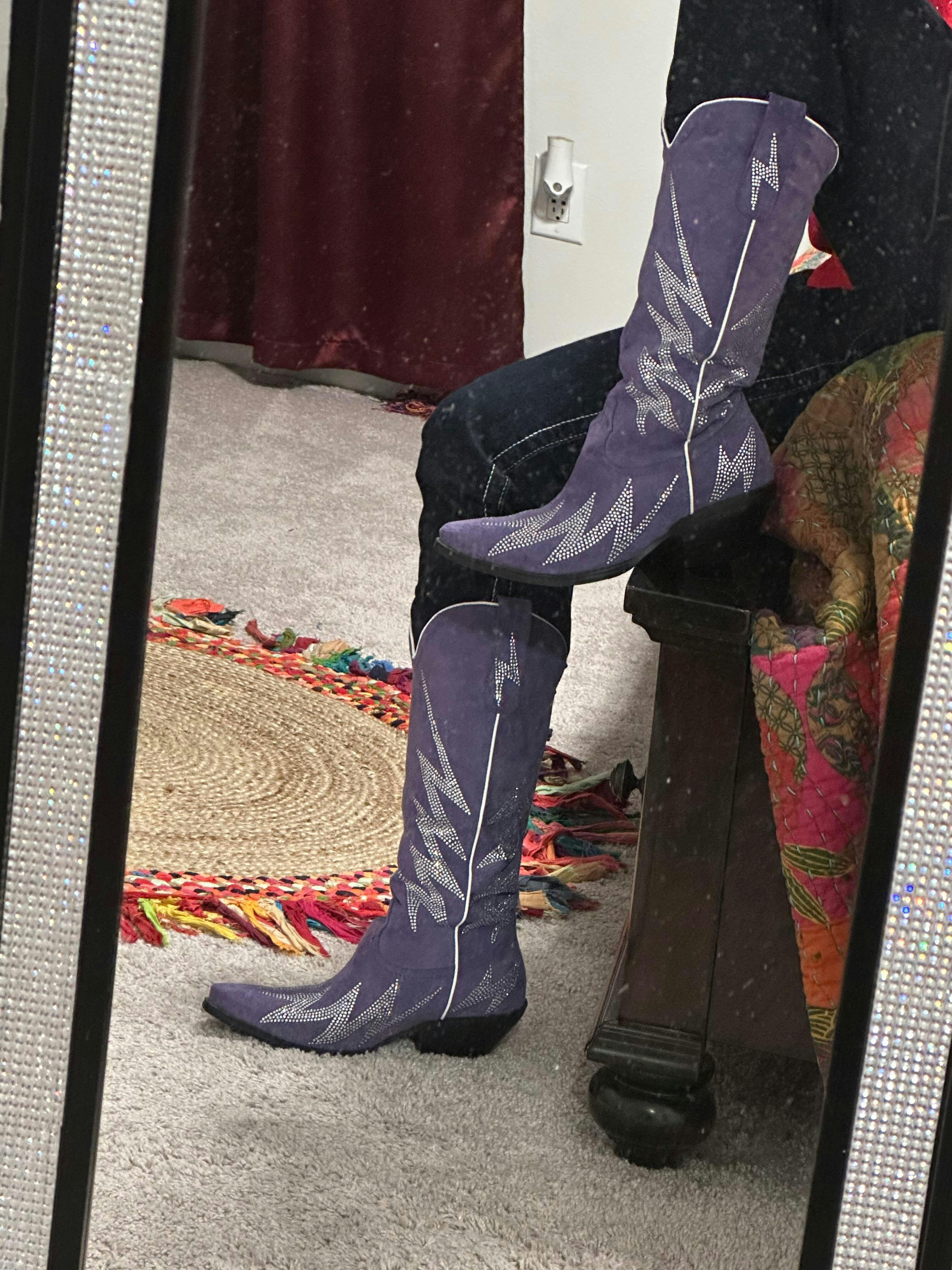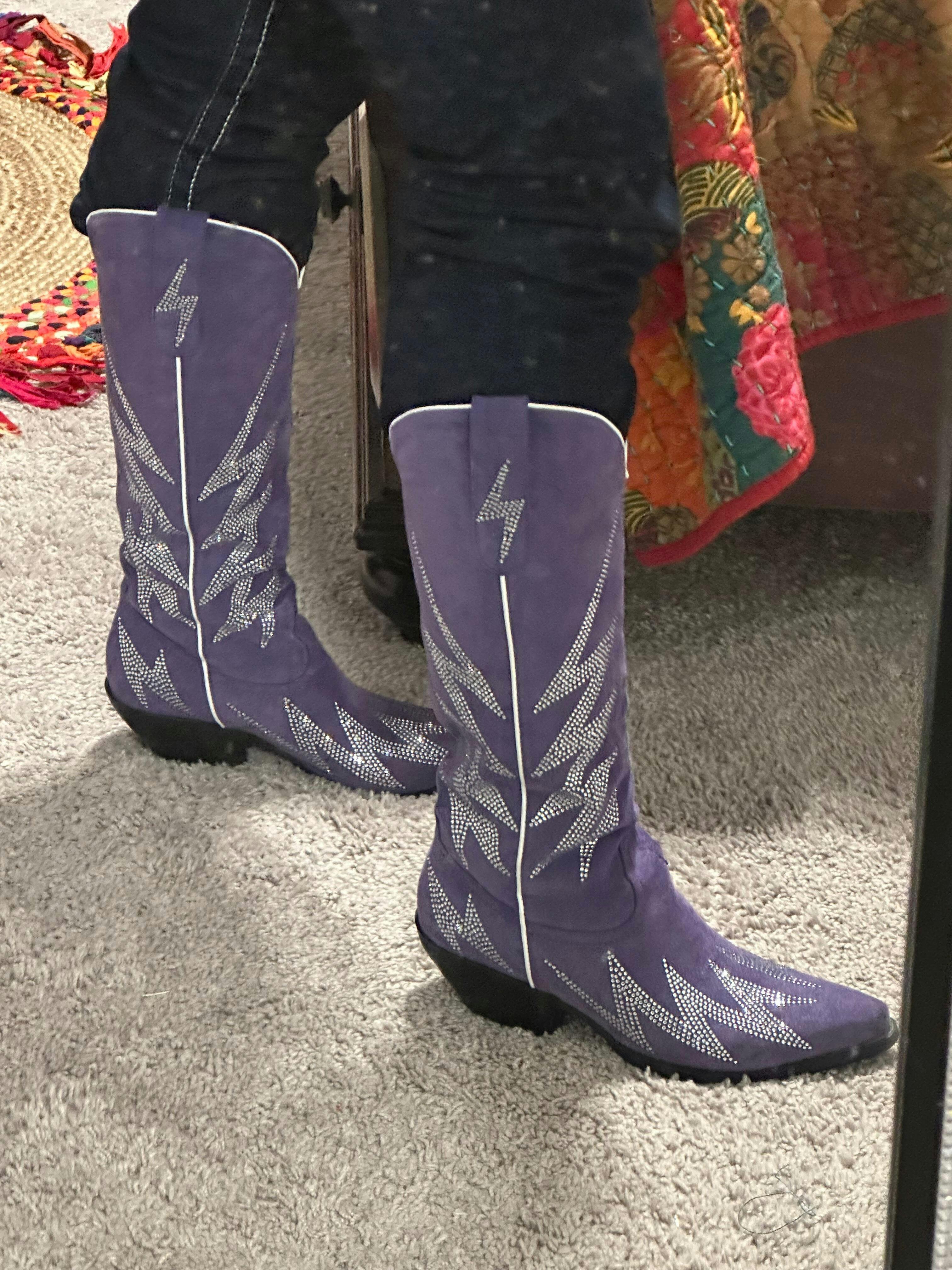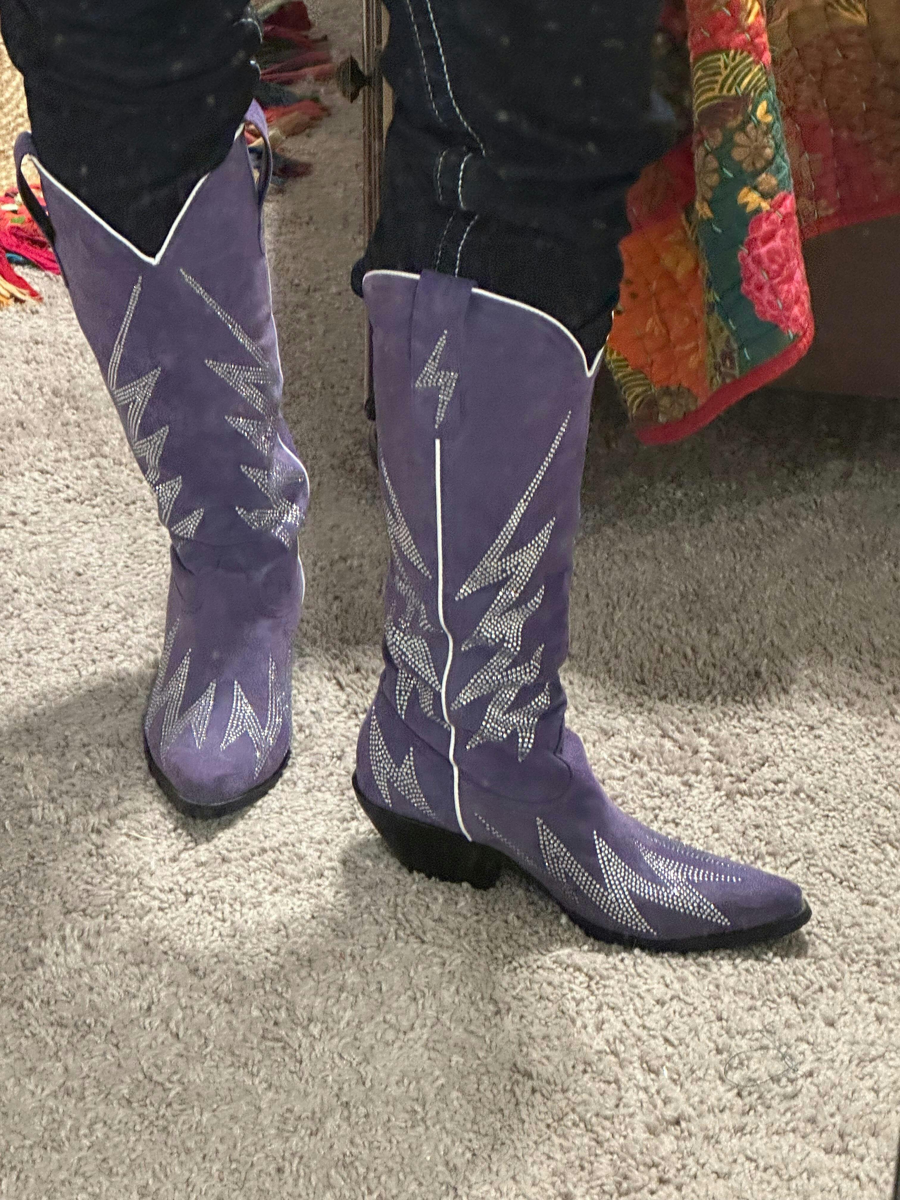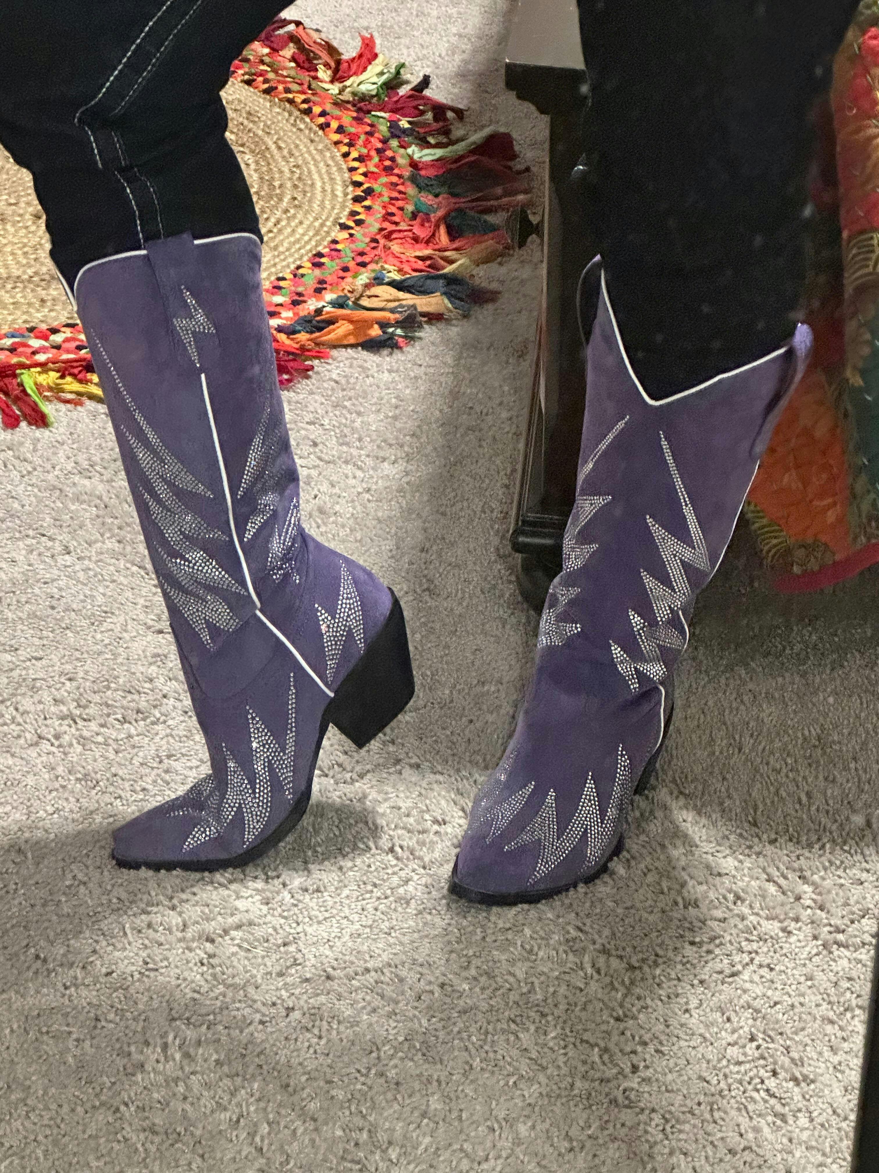 Estas llamativas botas vaqueras están diseñadas para electrizar tu estilo. Presentan una parte superior de ante sintético en morado rey intenso que irradia lujo y sofisticación. Audaces diseños de rayos adornan las botas con llamativos diamantes de imitación plateados. Su silueta clásica vaquera con puntera recortada ofrece estilo y comodidad.