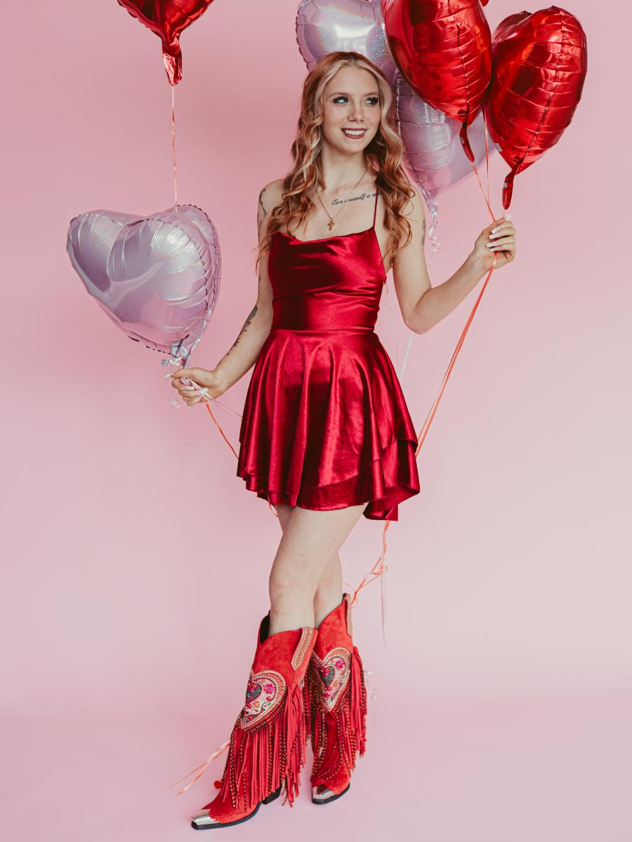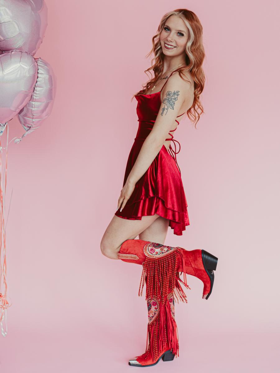 These Western boots crafted from vibrant red faux suede, The shaft dazzles with a large heart motif, filled with shimmering rhinestones. Finished with a bold metal snip toe, radiates passion, confidence, and unapologetic flair — the perfect Valentine’s Day gift for someone unforgettable.