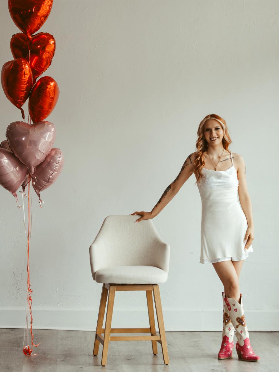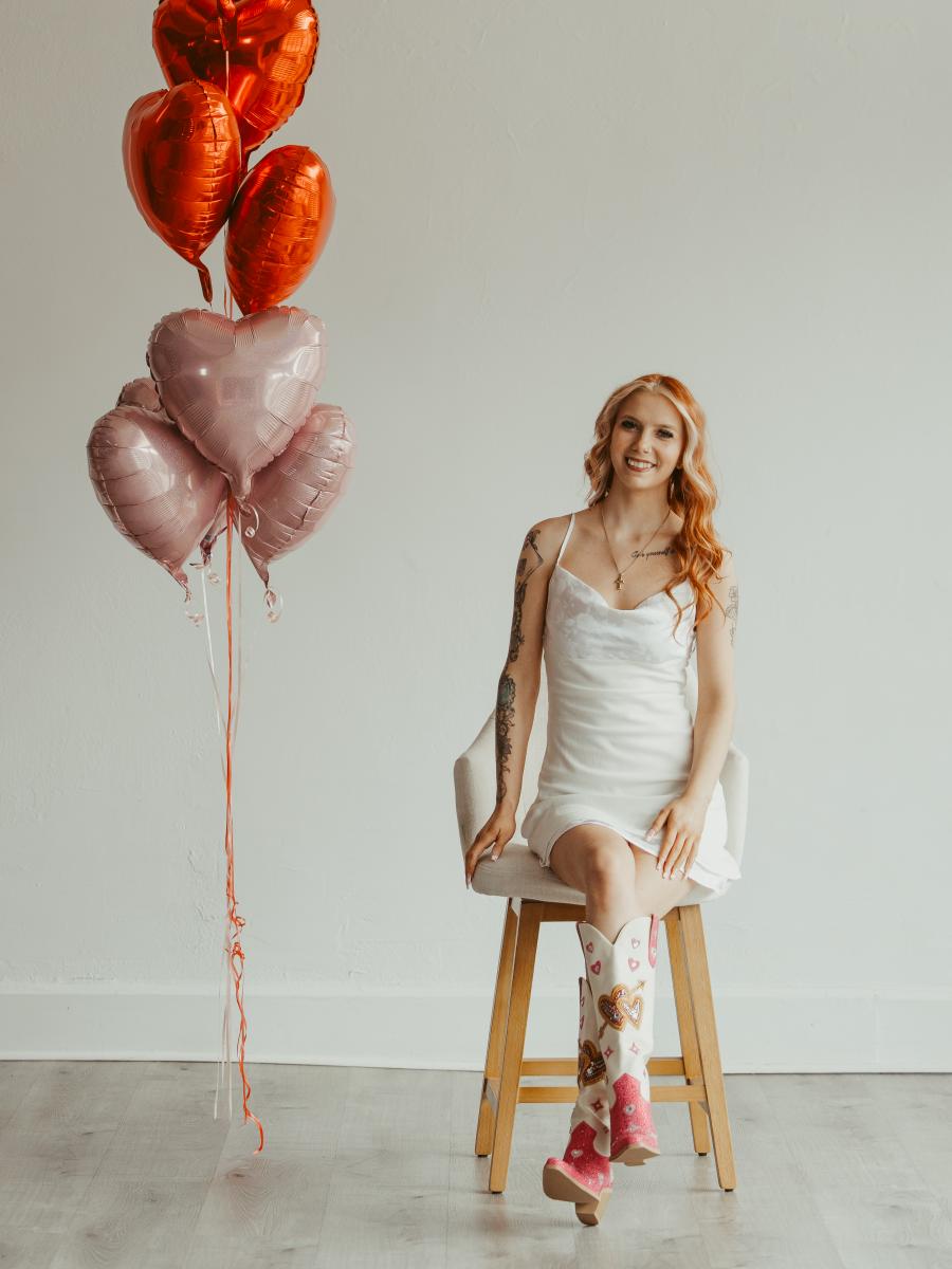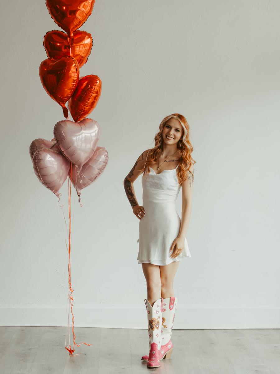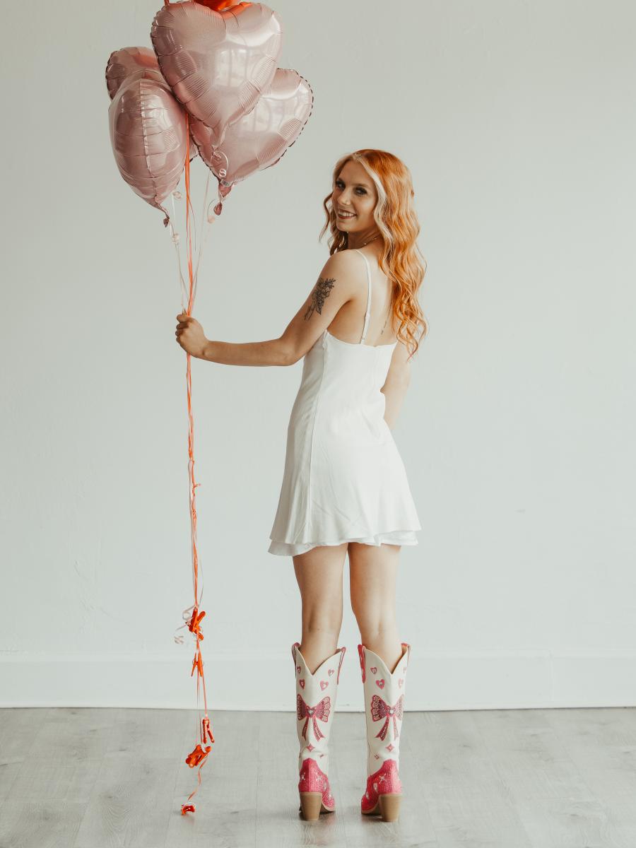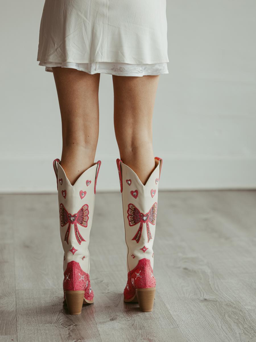 These knee-high cowgirl Valentine’s boots feature a creamy white shaft paired with a rose-red, rhinestone-studded upper. The shaft is adorned with sparkling heart motifs and bow motif. Radiates sweetness and romance—perfect as an unforgettable Valentine’s Day gift.