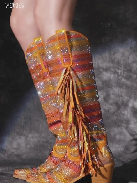 Luce una entrada deslumbrante con nuestras botas vaqueras amarillas. Su vibrante material amarillo, adornado con brillantes pedrería de colores y detalles de flecos laterales, le da un toque divertido, balanceándose con cada paso y aportando movimiento a tu look. Con punta puntiaguda y estilo de calce fácil, luce una silueta vaquera atemporal.