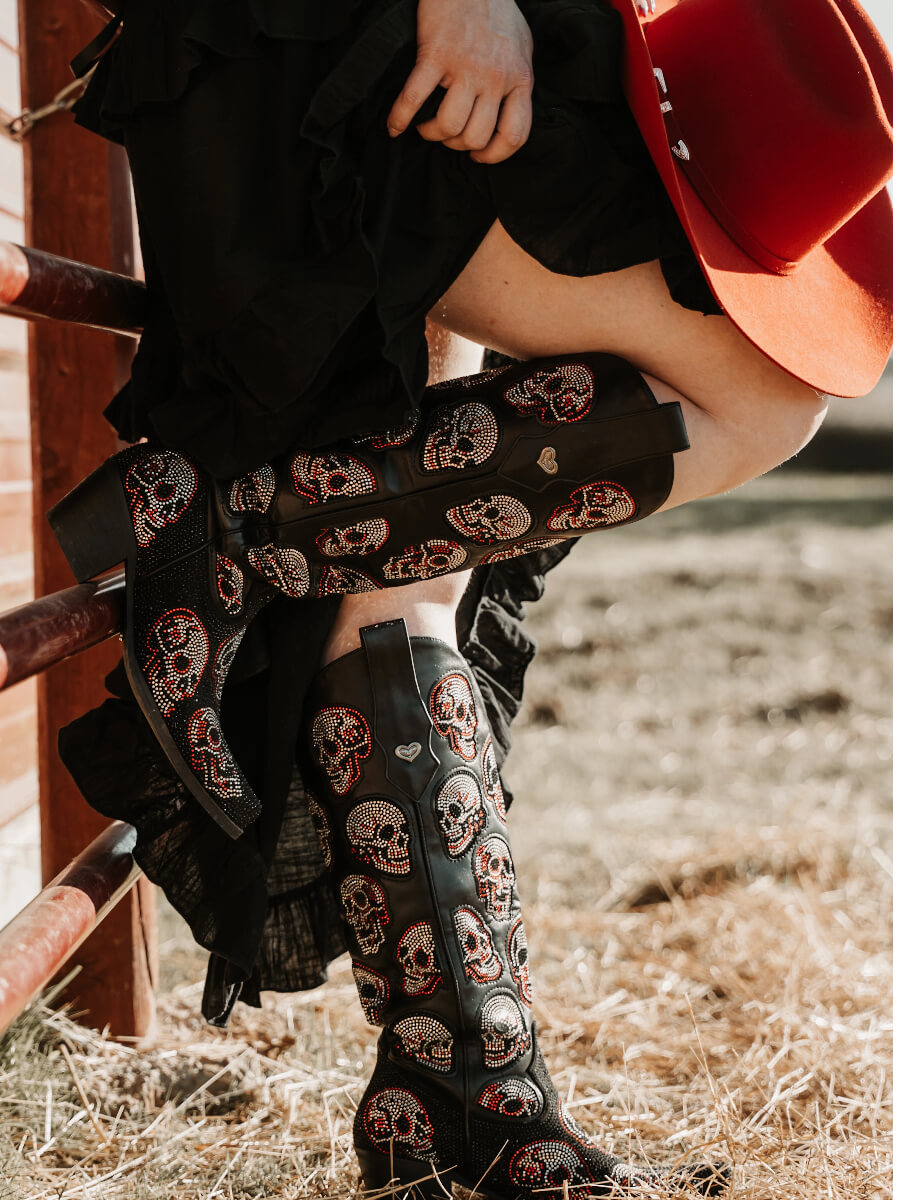 These black boots adorned with sparkling rhinestone skulls for a bold, eye-catching look. Crafted from premium PU leather and faux suede, they offer both comfort and style. Perfect for making a statement or completing a themed outfit, they’re designed to turn heads wherever you go.