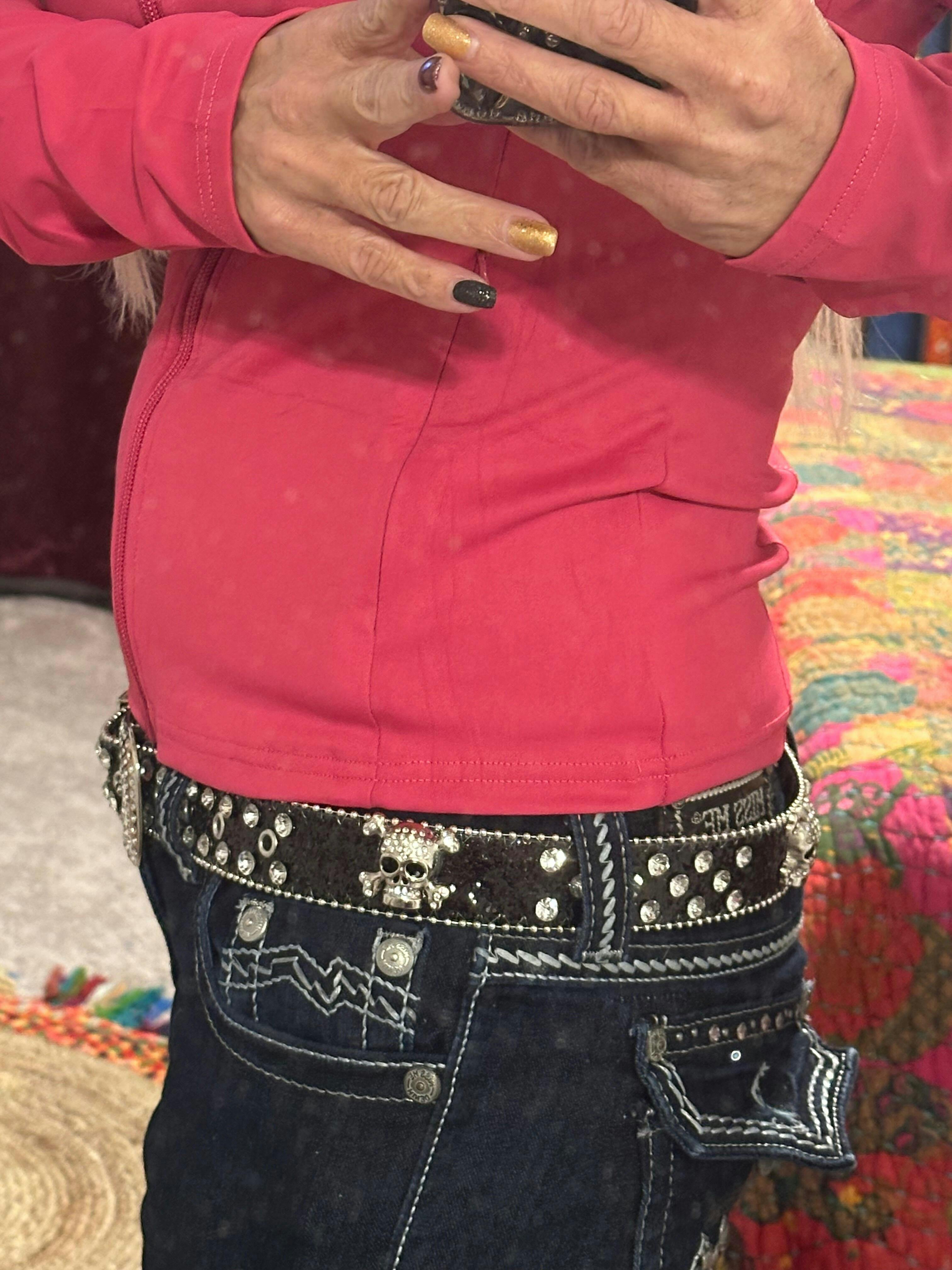 This is a sparkly black belt with black sequins and silver rhinestones and metal skulls, very cool. The buckle is also studded with many small rhinestones, and the sides of the belt are adorned with small round steel beads, making it exquisitely stylish.