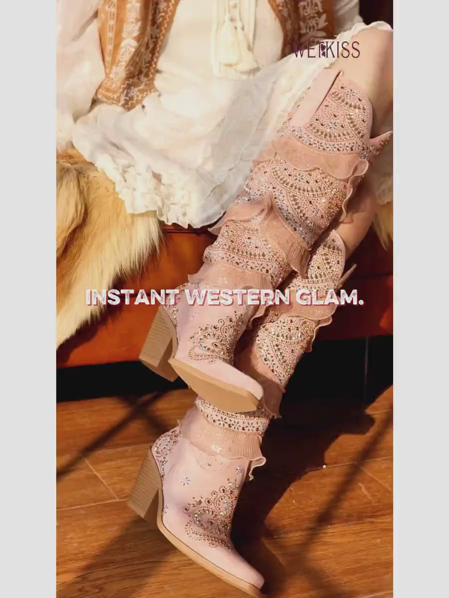 These Western cowgirl boots are crafted from muted pink faux suede, lavishly adorned with shimmering rhinestones and intricate lace-inspired detailing. Layered ruffled detailing along the shaft adds soft movement and a romantic, vintage-inspired charm.