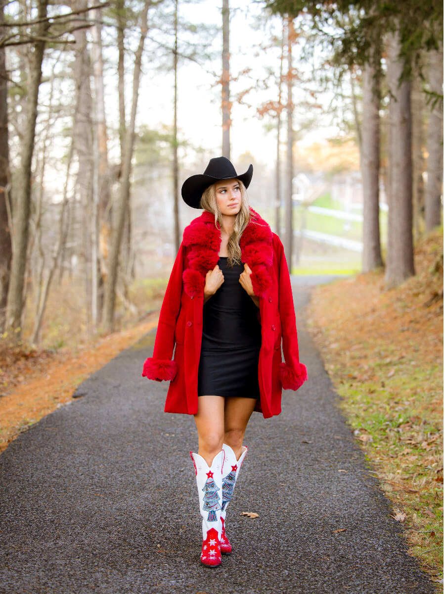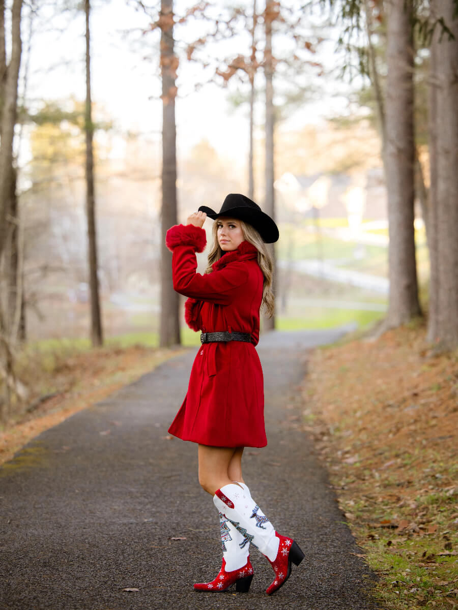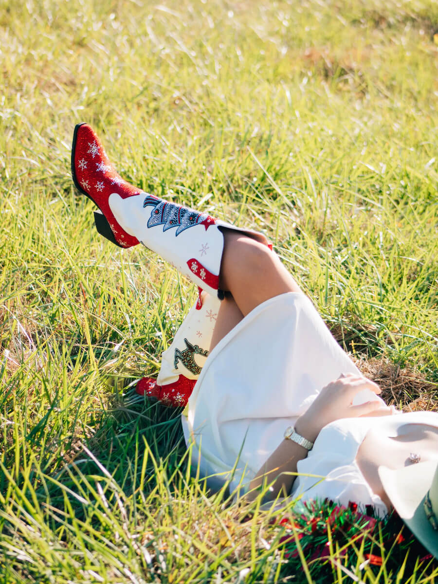 These knee-high cowgirl Christmas boots are primarily white, with a red rhinestone-embellished upper and a white rhinestone snowflake pattern. The boots are adorned with rhinestone-encrusted Christmas trees and elk motifs, along with snowflake decoration, perfect as a Christmas gift.