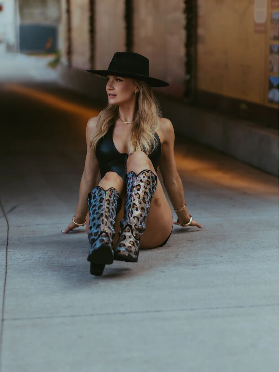 These boots feature a striking leopard pattern on premium faux suede. Sparkling rhinestone embellishments line the shaft and toe, catching the light with every step and adding a touch of glamour to this rugged design. With a classic pointy toe, 2.95" low chunky heel and a knee high height, versatile with any outfit!