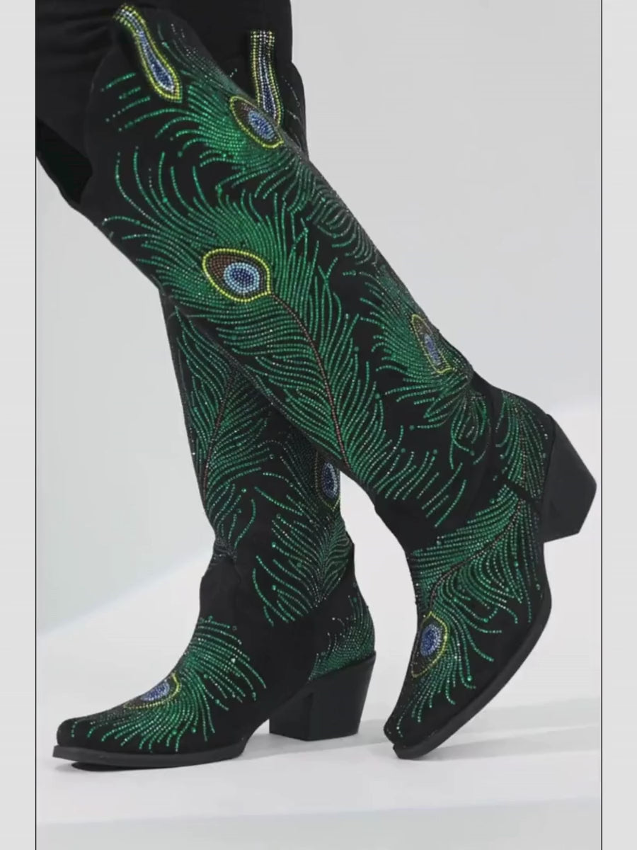These black western boots are crafted from faux suede for a smooth, comfortable feel. Yellow, blue, and green rhinestones arrange delicate peacock feathers. Distinctive and elegant. Perfect for making a statement.