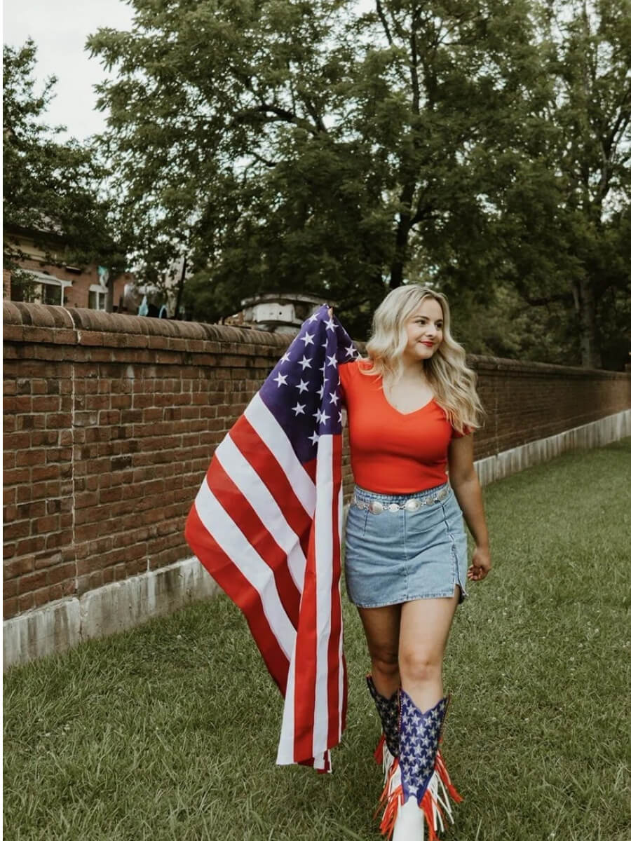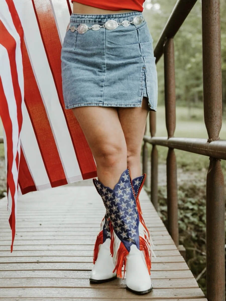 Step out in undeniable style with these patriotic fringe American flag Western boots. The vibrant white and red fringe creates captivating movement, infusing your stride with playful energy. Sparkling star rhinestones add a touch of glamour, ensuring you shine. Designed for comfort, the mid-calf cut and chunky heel let you enjoy every moment, whether you're at a festival or out on the town.