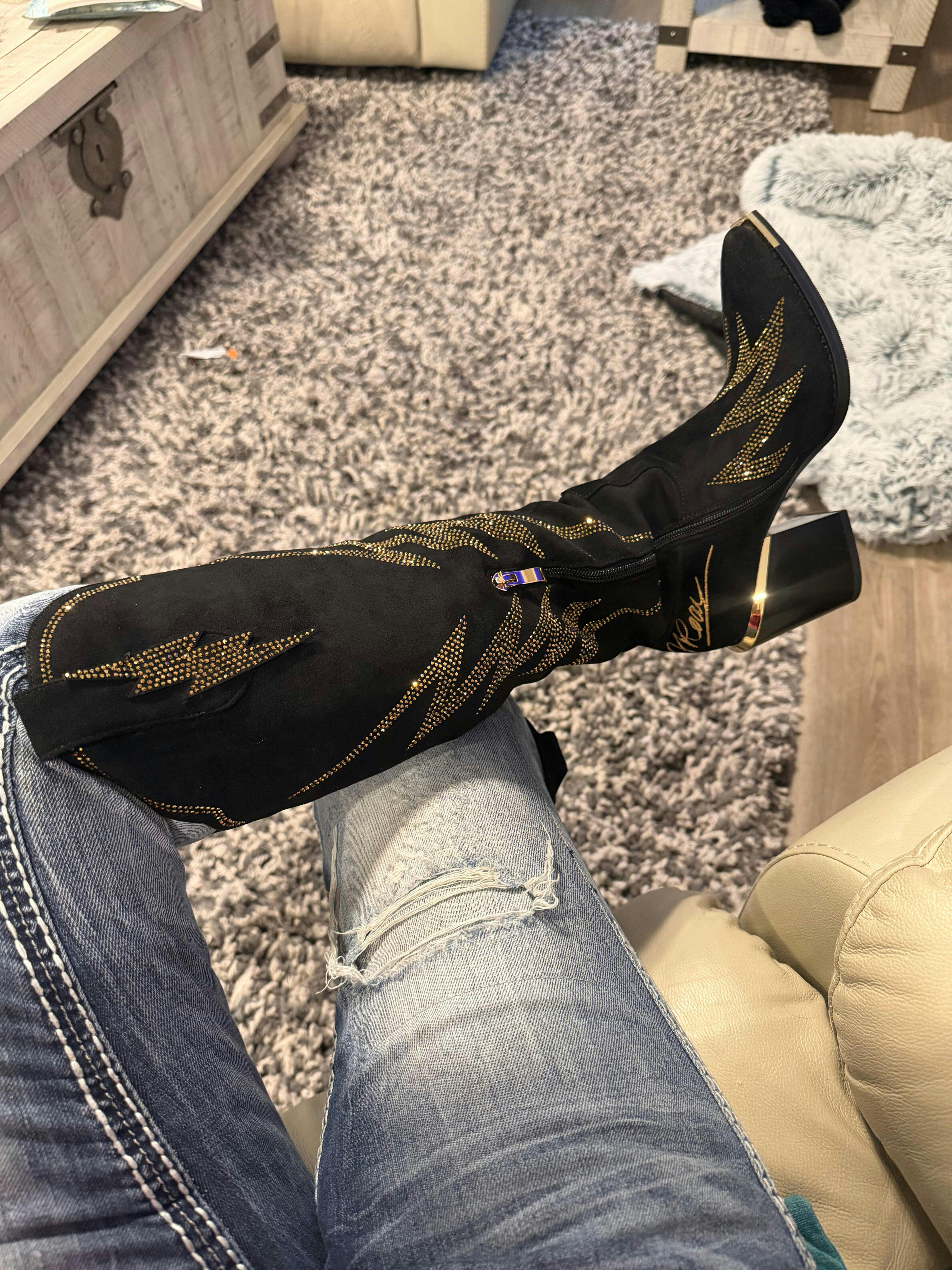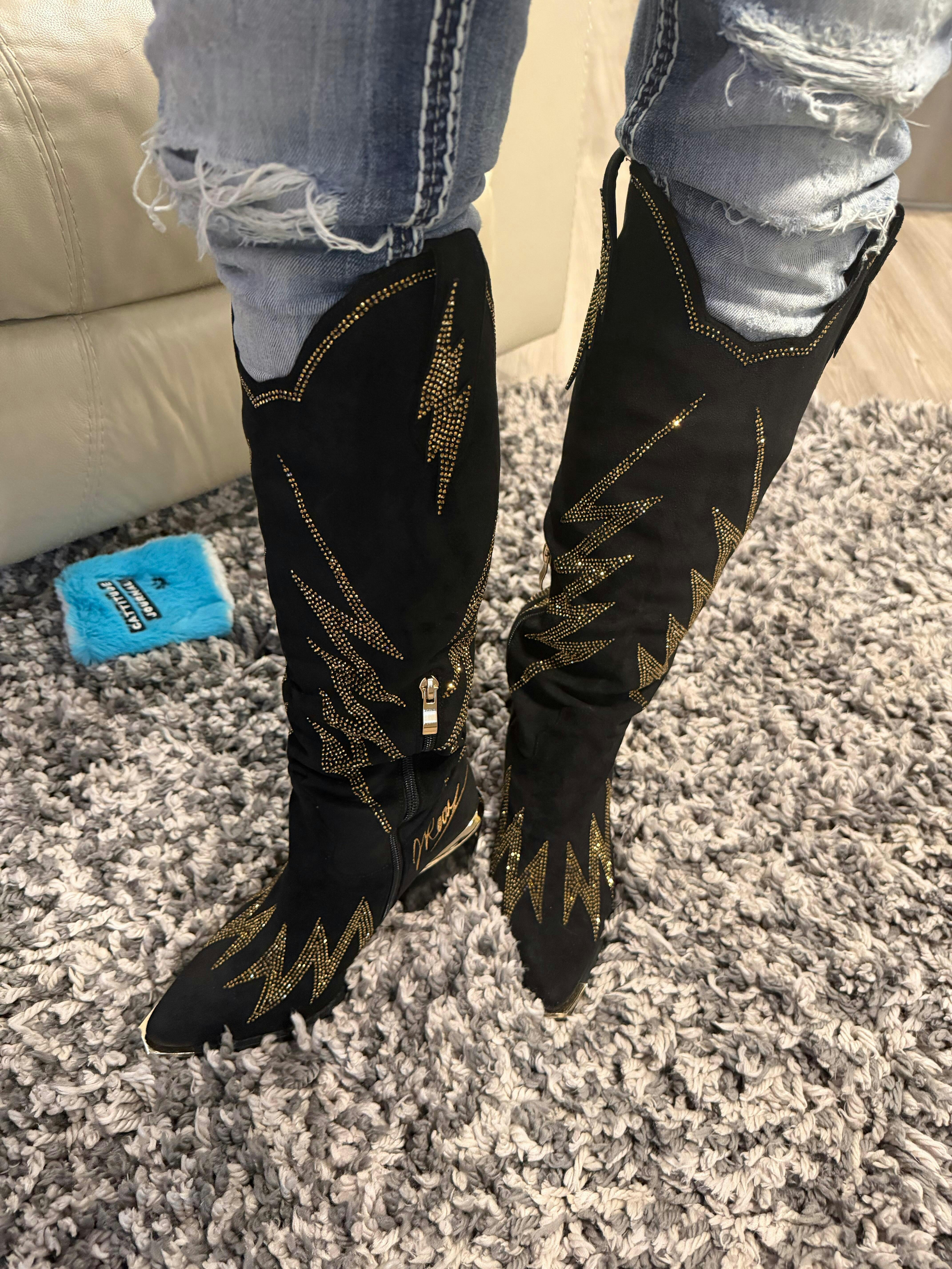 Influencer Co-branded Lightning Boots: Strike a pose in these black, knee-high cowboy boots. Crafted from luxe faux suede, they feature bold, gold lightning bolt embellishments that electrify any look. A modern block heel adds comfortable height. Make a statement, day or night.
