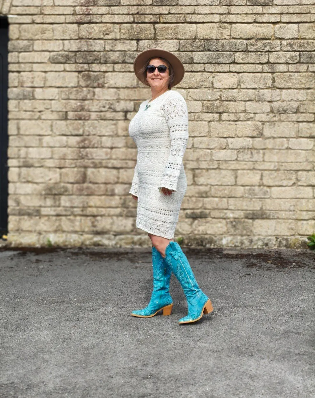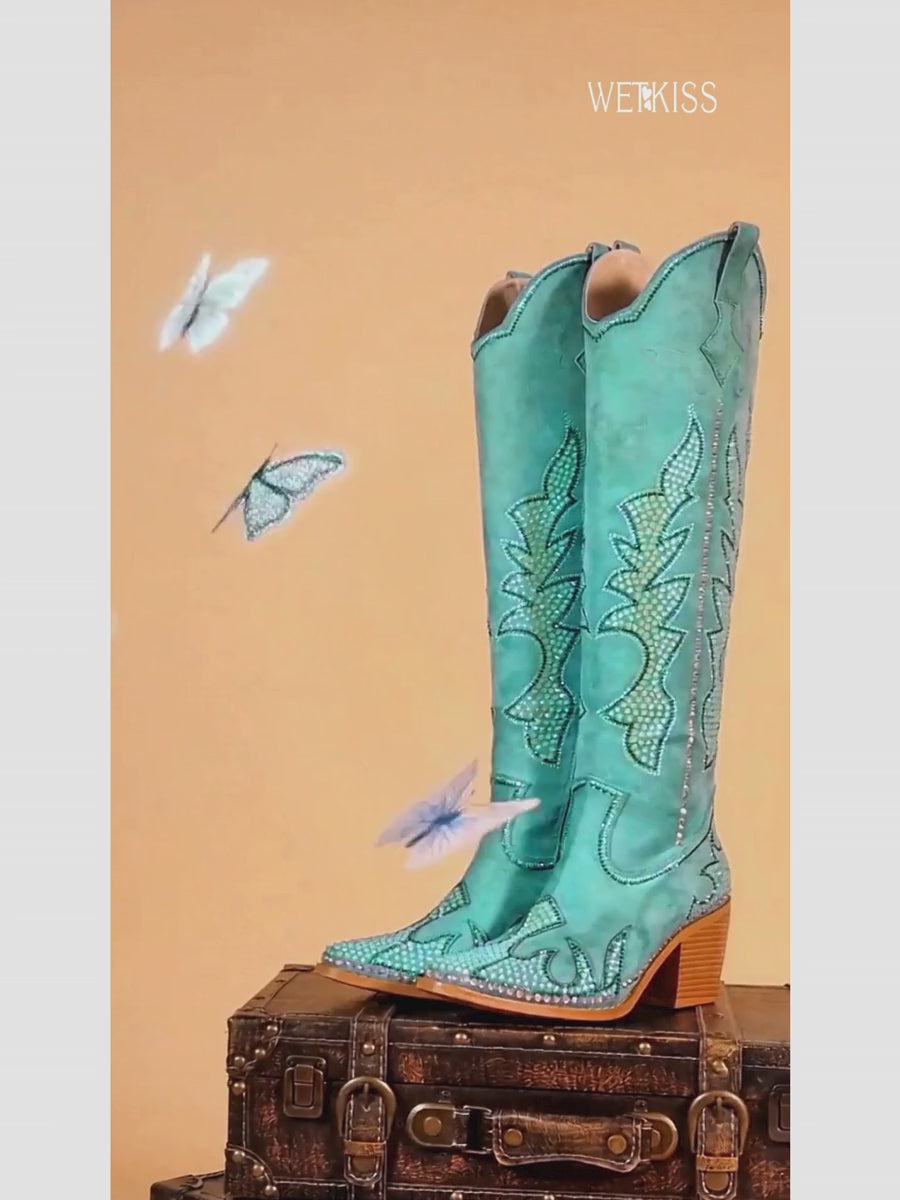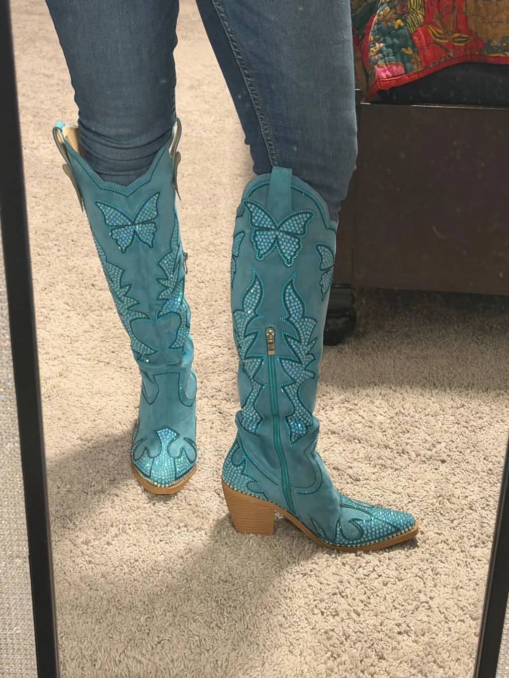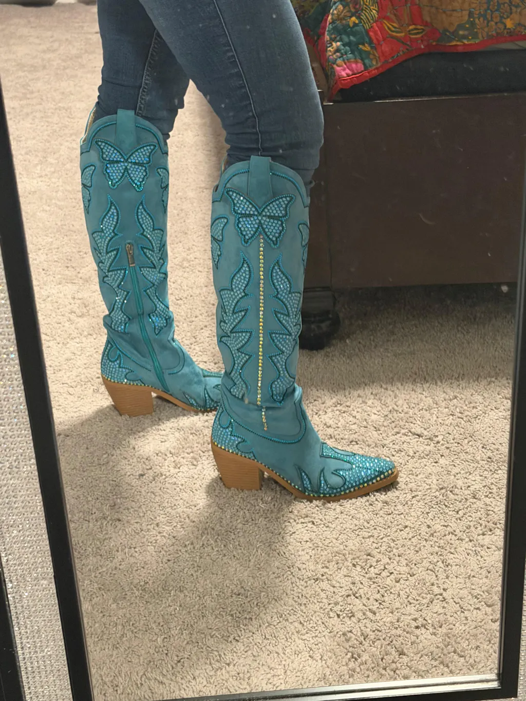 Step into Western enchantment with these dazzling rhinestone cowboy boots! Crafted from premium faux suede with a classic snip toe for both durability and comfort, these boots feature eye-catching butterfly prints in a vibrant turquoise color. Embellished with sparkling rhinestones that shimmer with every step, they'll add the perfect touch of glamour to any outfit.