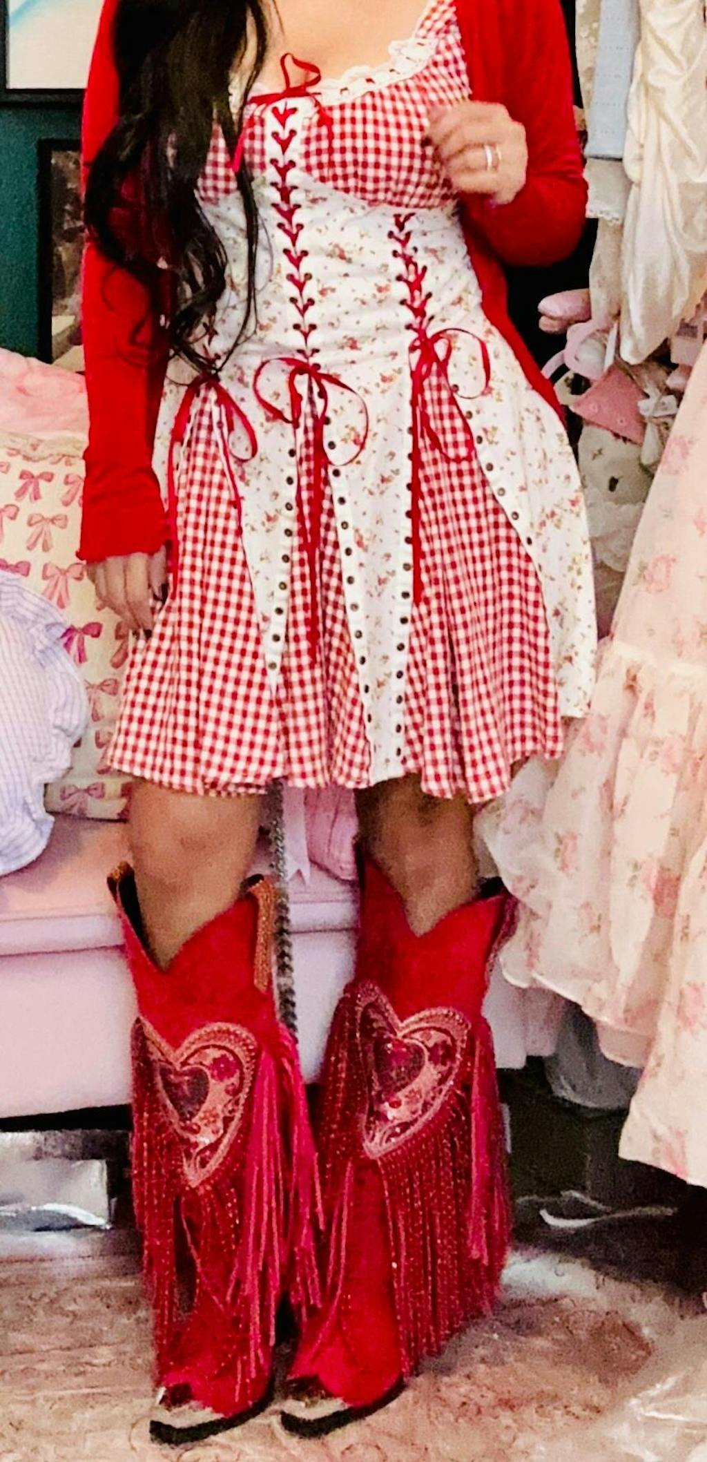 These Western boots crafted from vibrant red faux suede, The shaft dazzles with a large heart motif, filled with shimmering rhinestones. Finished with a bold metal snip toe, radiates passion, confidence, and unapologetic flair — the perfect Valentine’s Day gift for someone unforgettable.