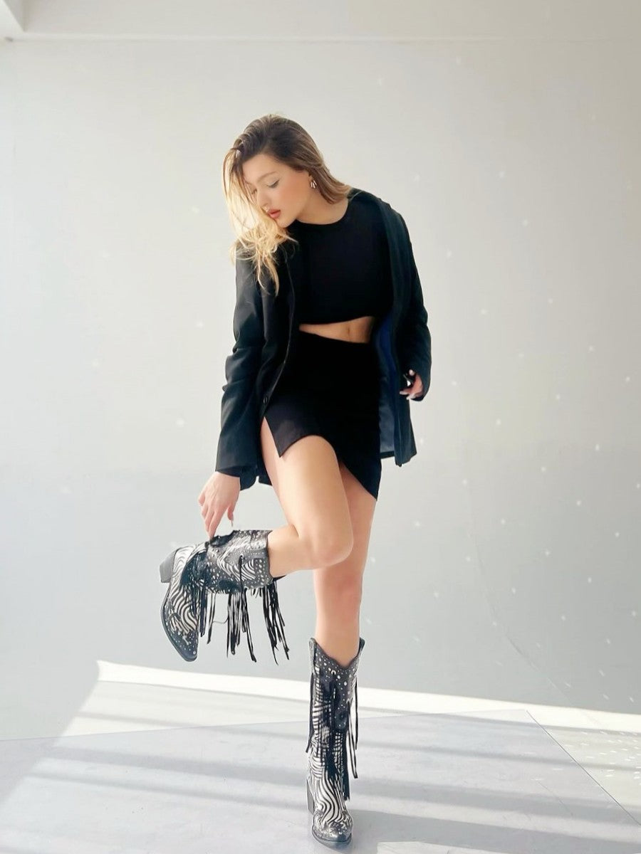 Unleash your wild side with Wetkiss's Zebra Stripes Studded Cowgirl Boots! A must-have for animal print enthusiasts, these handcrafted boots feature a bold zebra pattern, perfectly complemented by a riveted tassel design. Embrace your inner rebel with a boot that truly embodies wild, untamed style.